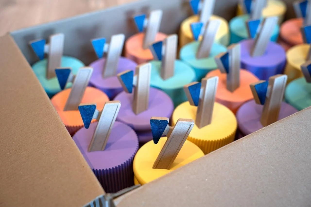 Trois modèles de trophées proches mais différenciés, avec le logo simplifié de Yousign, déclinables en plusieurs coloris, et surtout empilables. Une chose à laquelle je n’avais pas du tout pensé mais que j’ai adoré ! Parce que ça renforçait l’envie d’en gagner plusieurs, et parce que ça renforçait également l’unicité de chaque composition ! Plus les personnes en gagnaient, plus ça démultipliait la valeur ajoutée !